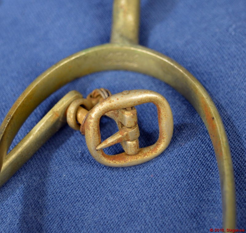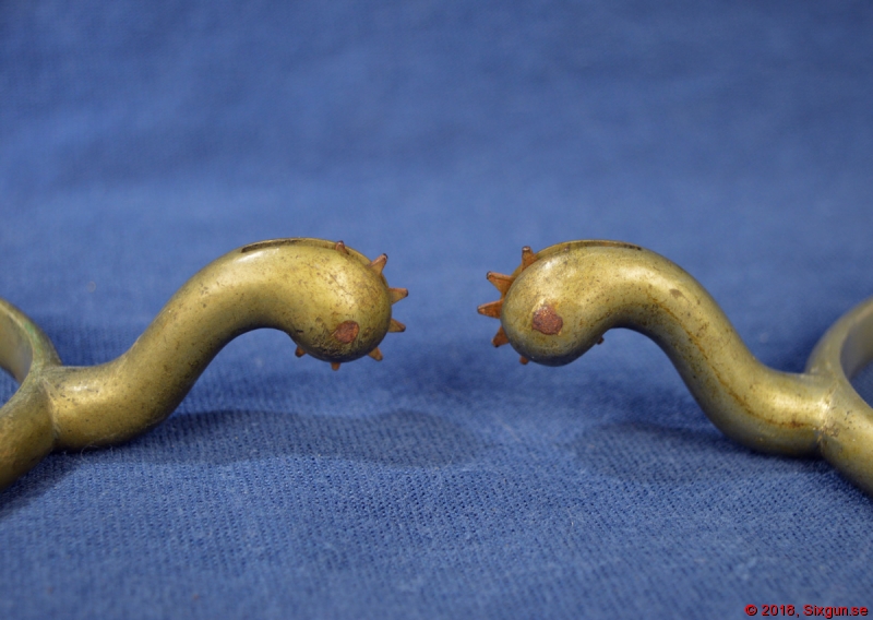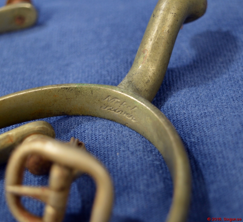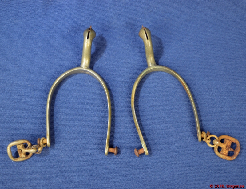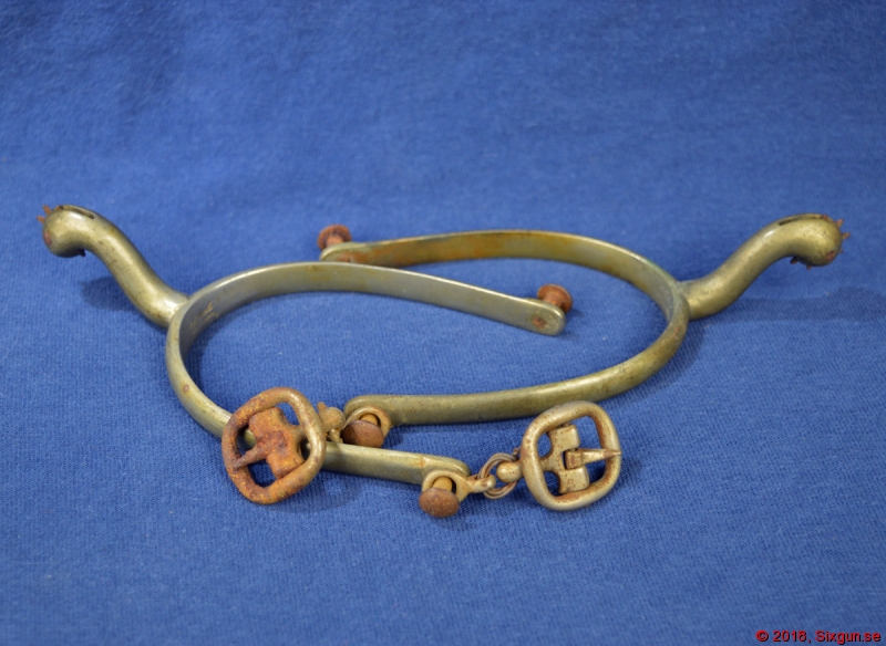 Ett par nickelsilverpläterade officerssporrar från senare 1800-tal. Remspänne på ena sidan av vardera. En liten länk till ena remspännen har ersatts och det finns en del korrosion, speciellt på det ena spännet - i övrigt i mycket bra skick.