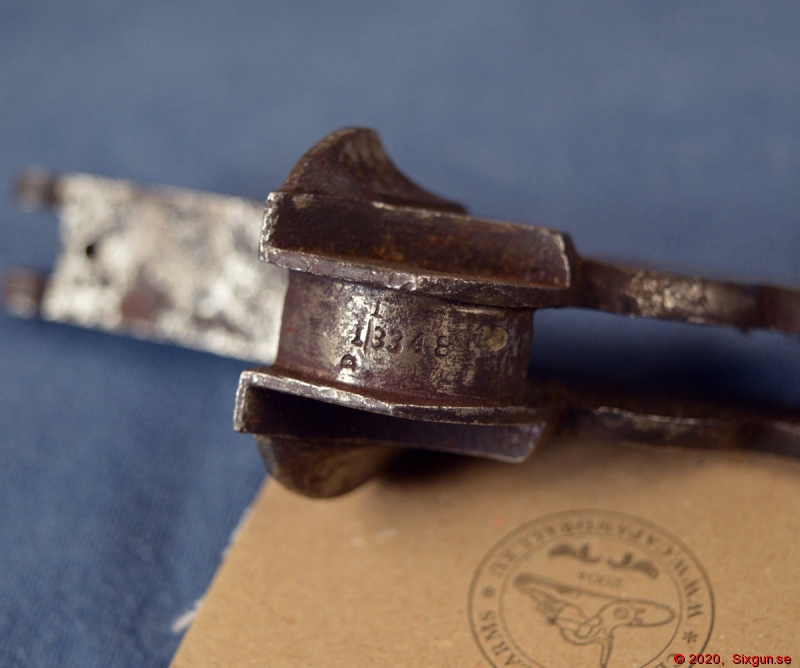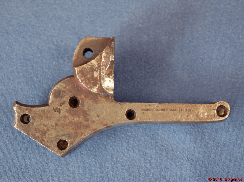 Nedre stomme för en Starr Model 1858 DA .44 revolver. SN 13348 och militär inspektörsstämpel 'C'. Ingen av ytbehandlingen finns kvar men Starrs fabriksstämplar är fortfarande läsliga. Spår av hanskruvens gänga sitter kvar och avtryckarskruvens gängor verkar också vara skadade. Billig stomme som kan fixas av den händige.