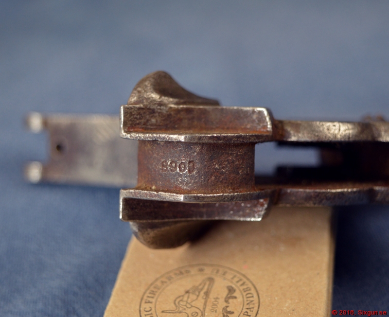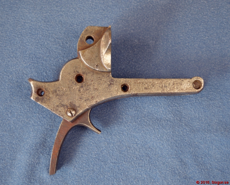Nedre stomme för en Starr Model 1858 DA .44 slaglåsrevolver. SN 8908 och militär inspektörsstämpel 'H'. Ingen av ytbehandlingen finns kvar (porig) men Starrs fabriksstämplar är fortfarande läsliga. Spår av hanskruvens gänga och främre stomskruven sitter kvar i hålen. En avbruten varbygel sitter fast med originalskruv. Billig stomme som kan fixas av den händige.