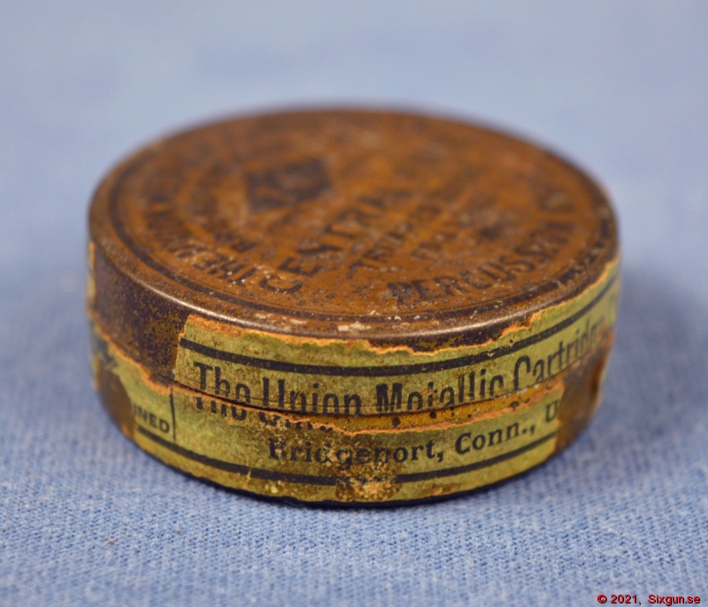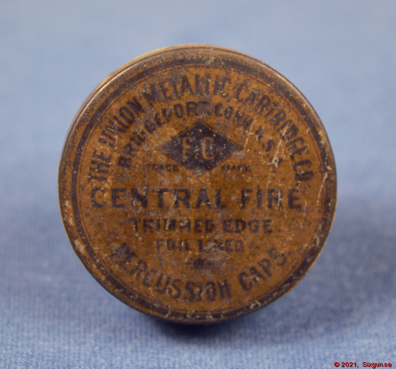Dosa för 100st United Metallic Cartridge tändhattar, märkt Central Fire, Trimmed Edge Foil Lined. FC (?) in en rhombisk ram används från runt 1885 fram till ca 1910. Begreppet central fire användes för slaglåständhattar långt innan den användes för mässingshylsor. Bra skick med en del av förseglingen bevarad. Tom.